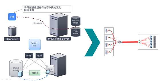 而Citrix采用了更廉价更聪明的做法。既然磁盘操作是计算环节中最慢的部分,那我就尽量避免它。Citrix在其两种镜像管理方法中都使用了镜像缓存技术来分担对共享存储的压力。例如PVS, 镜像不再是从共享存储上直接访问,而是由“Provisioning Server”来统一分发。“Provisioning Server”会将母版镜像缓存在内存中,通过网络流送给虚拟桌面。由于整个路径上都是电气信号的转换,所以性能比磁盘的机械操作要快得多。大家可以参考以下视频,更直观地了解PVS的开机性能(Ardence是Citrix收购前的名称)。