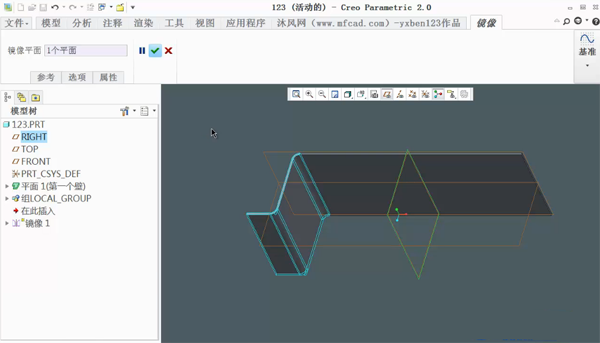 6、然后选择镜像命令,选择创建的两个法兰壁进行镜像,选择front面为对称面,如图所示: