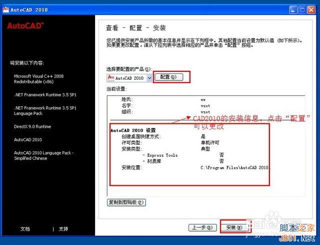 确认CAD2010的安装信息后点击“安装”开始安装CAD2010 32位中文版 点击“配置”可以修改CAD2010的安装信息 如图七。