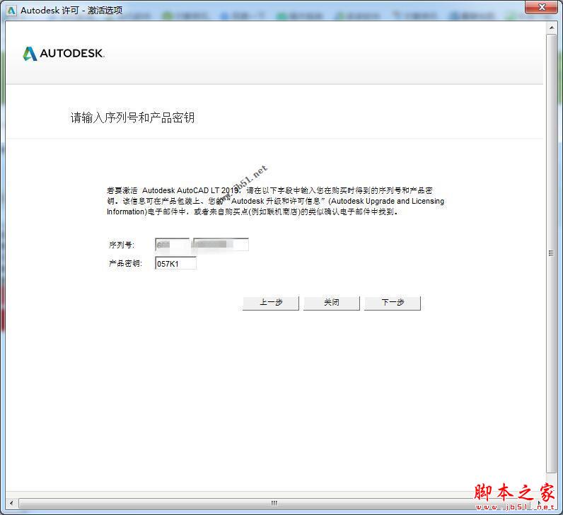 AutoCAD LT 2019 产品密钥: 057K1 序列号:356-72378422