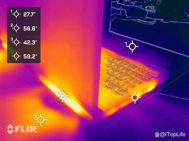 而光影精灵9尾部留足的散热口被证明是有效的。开启笔记本的狂暴模式时,压力测试下可以看到光影精灵9的温度控制不错,高温除了集中在屏幕下方,键盘中部和左侧预留的出风口,不会影响键盘的使用,掌托和触控板则保持清凉。
