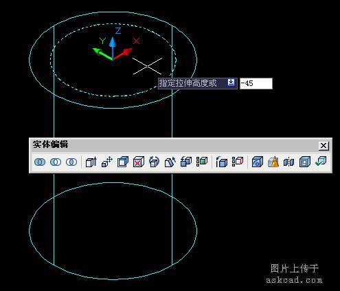 4、先伸好了大圆柱后,利用ucs移动坐标,把大圆柱的顶面作为x-y平面,然后在圆柱顶面捕捉圆心点作为小圆的圆心,画好小圆后拉伸成小圆柱(拉伸这时要取负数!回头看看上面的讲解,注意看当前坐标轴就会明白为什么么了,就这么简单。)