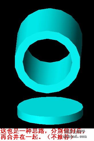 现在明白如何是倒着的杯子了吧,因为画大圆柱与小圆柱的起始位置在同一面上,而画的是一大一小的圆柱,当取差集时,就得到这样的倒口杯子。如何解决呢,这就太简单了,画好两个圆柱后,把小的移动到上面,再取差集就可以了。或者把倒口的杯子旋转180度也得到正着的杯子。从这个基本操作可以看出,第一步要构思好思路,画三维图要不断地检验自己的判断能力,这是提高能力的好办法,如何做呢?就在着手开画时,想想最后得到怎样的结果,是否和自己想的一致?如果说,每次都和自己头脑构思的一致,说明你已经上路了。