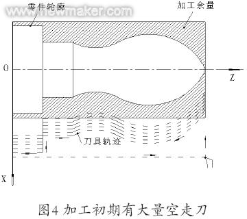 可以加工出所需工件,但在加工R30圆弧时出现了刀具干涉,经过重新刃磨刀具,第二次加工才得以成功。该种编程方法的优点是:只要改变刀具加工起点,通过反复调用轮廓子程序,可以多次加工同一个形状的轮廓,做到层层去除加工余量,最后达到零件尺寸的目的,程序文件短。但循环次数多,在加工初期有大量空走刀现象(见图4),加工效率极低。并且,程序中刀具加工起点和循环次数的确定是编程的难点,对编程初学者来说这两个参数的确定是非常容易出错的,循环次数计算错误会导致轮廓尺寸偏大或偏小。而且,华中I型数控系统在加工前无法进行刀具干涉检查,对加工不利。