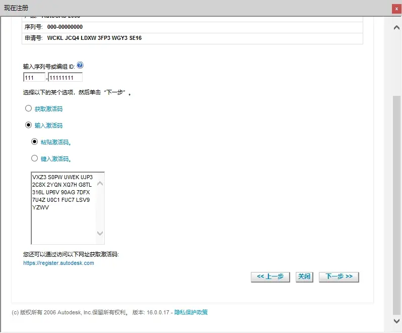 16. 复制申请号里面的内容(ctrl + c),输入序列号:“111-111111”,点击“输入激活码”和“粘贴激活码”。