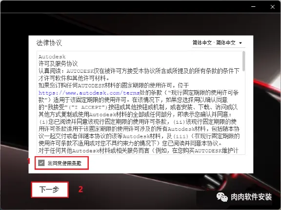 7. ①勾选”我同意使用条款“; ②点击”下一步“;