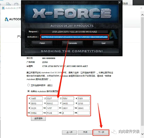 29.全部选中Activation中生成的激活码(仔细检查是否复制完整),使用Ctrl+C键或者鼠标右击复制生成的激活码,然后粘贴激活码至我具有Autodesk提供的激活码方框中,最后点击下一步。