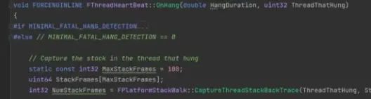 为了解决业务问题,虚幻引擎还封装了一个单独的守护进程线程ThreadHeartBeat。当检测到线程的心跳超过时间限制时,还会在内部调用上面的函数,将卡住的线程堆栈输出到Log中。