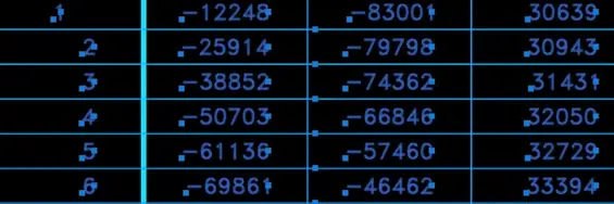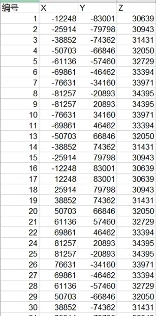 为便于描述,以下列数据为例,其中第1列为序号,第2、3、4列为x、y、z空间三维坐标),表格如下。