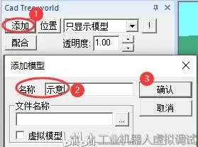 7、简易模型创建:在模型树面板上点击添加按钮,弹出添加模型对话框,输入名称后确定,弹出对话框选择确定;