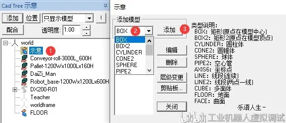 8、简易模型创建:模型创建后如下图所示,鼠标左键双击后出现一个对话框,选择需要创建的模型的类型,然后点击添加按钮弹出模型创建对话框,就可以创建各类型的简易模型,并可以设置模型的颜色,完成确定、关闭对话框;