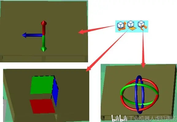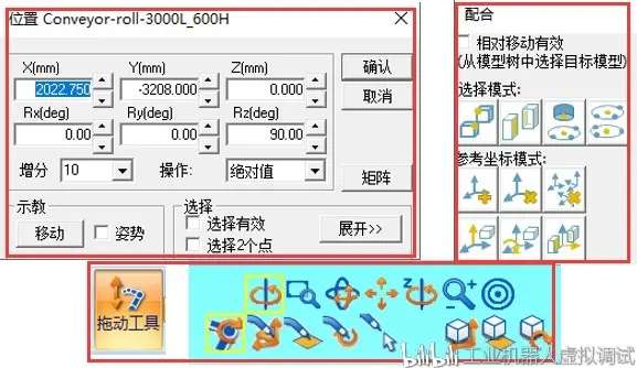 6、资源拖动工具的使用:此三个命令类似机器人的拖动命令,第一个是沿着轴线移动;第二个是在平面内移动;第三个是绕着轴线转动,移动量和转动角度的设置同上;