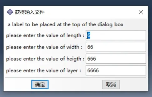 运行脚本后,提供一个对话框,用户可输入多个参数,以上参数将用于后续建模中,可直观地进行建模操作。默认输入的数据类型为字符串类型。如下图。