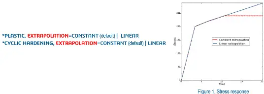 当屈服应力超出指定范围时,用户可以指定屈服应力是保持不变(默认)还是在指定的数据范围之外线性外推。该功能适用于以表格形式指定的各向异性硬化曲线。只影响屈服应力相对于等效塑性应变的外推,对其他独立变量(例如TEMP、FVs)仍采用恒定外推法。