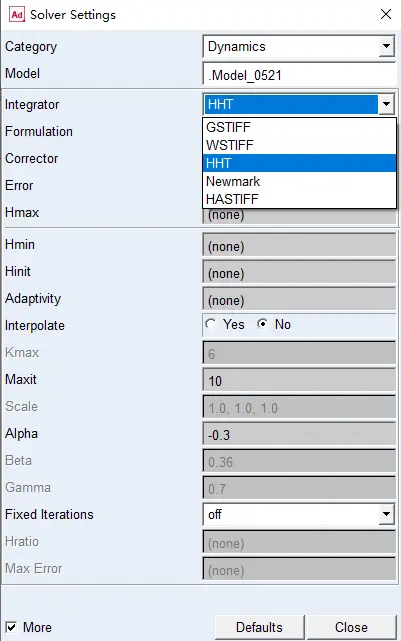 ADAMS view--settings--solver--dynamics--integrator--HHT
