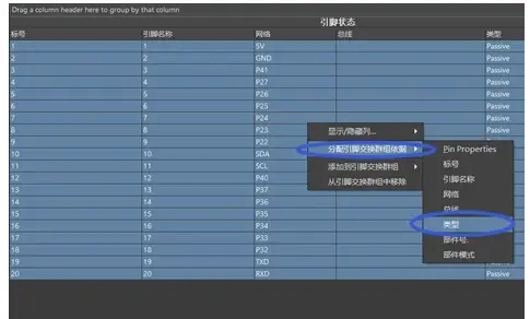 3、全选引脚,并右击鼠标,如图所示选择配置: