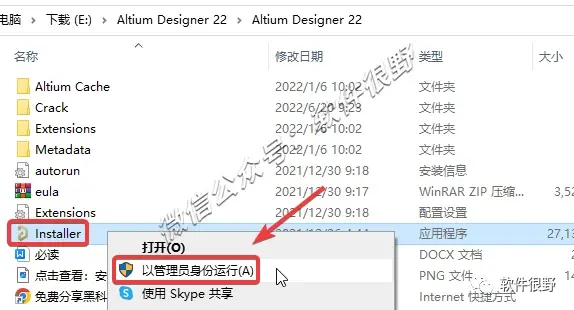 2.打开刚解压后的【Altium Designer 22】文件夹,鼠标右击【Installer】选择【以管理员身份运行】。