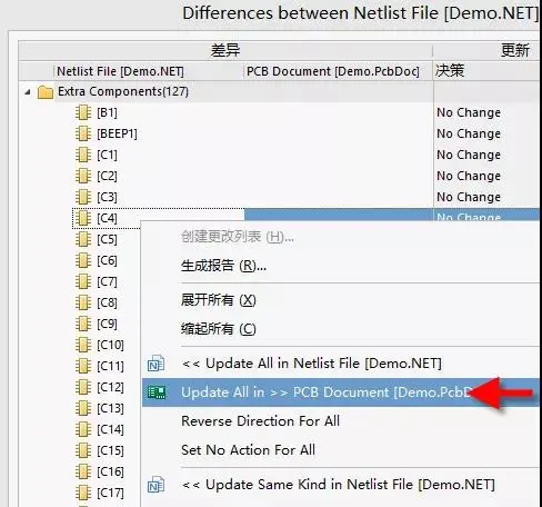 (3)出现对比结果反馈窗口,如图8-21中左图所示,继续右键选择执行“Update All in>> PCB Document [Demo.PcbDoc]”命令,即把网表和PCB对比的相关所有结果准备导入进去PCB。