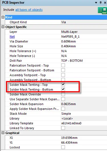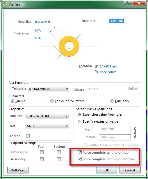 2)双击过孔进入过孔属性设置窗口,如图2所示,勾选“Force Complete Tenting On Top”与“Force Complete Tenting On Bottom”,即可完成盖油设置,可以锁中所有过孔,全局操作勾选盖油选项。