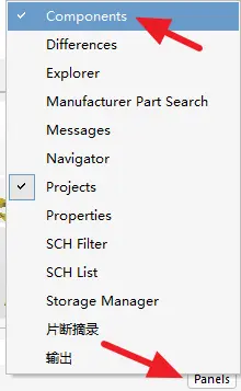 第二种:点击左下角的“Panels→components”既可调出消失的库列表,如图2-17所示。