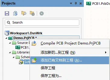 答:经常需要把已存在的元件库(公司或个人总结统一的库)添加到已存在的工程目录下,方便调用。可以在工程文件上单击鼠标右键,执行右键下拉菜单中的“添加已有的文档到工程”命令,如图2-5所示,选择其需要添加的元件库,然后保存一下工程即可完成添加。