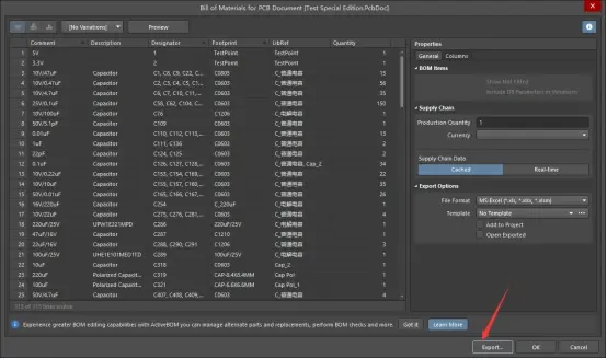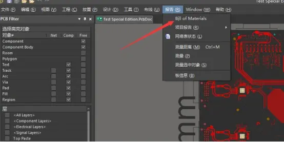 在报告(report)打开Bill of Materials(在PcbDoc或者SchDoc打开都可以)
