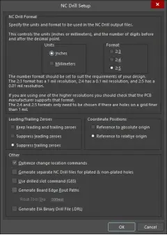 选择好格式(公司规定为2.4格式,INCHES,TRAILING ),点击OK系统则自动将钻孔文件输出到PCB文件所在的目录中