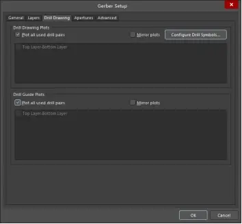④选择Drill Drawing项出现以下画面 ,选择Plot all used layer pairs,选择Plot all used layer pairs,关闭Mirror plots,关闭Mirror plots,点击OK