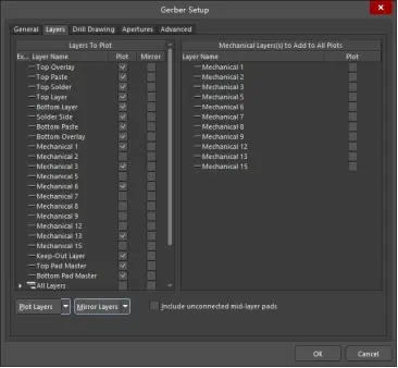 ③下拉Plot Layers 选择used ON,下拉Mirror Layers 选择ALL OFF,如果要内层孤立焊盘,则选择Include unconnected mid-layer pads,点击OK