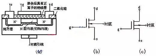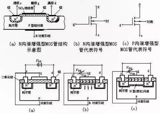 图(a)、(b)分别是它的结构示意图和代表符号。代表符号中的箭头方向表示由P(衬底)指向N(沟道)。P沟道增强型MOS管的箭头方向与上述相反,如图(c)所示。