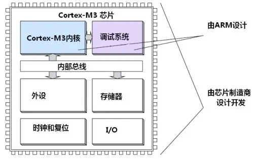 基于Cortex-M3的MCU:Cortex-M3+存储器+外设等。Cortex-M3内核通过接口总线的形式挂载了储存器、外设、中断等组成一个MCU。