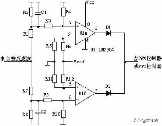 AC输入和DC输入的开关电源的输入过欠压保护原理大致相同。保护电路的取样电压均来自输入滤波后的电压。 取样电压分为两路,一路经R1、R2、R3、R4分压后输入比较器3脚,如取样电压高于2脚基准电压,比较器1脚输出高电平去控制主控制器使其关断,电源无输出。另一路经R7、R8、R9、R10分压后输入比较器6脚,如取样电压低于5脚基准电压,比较器7脚输出高电平去控制主控制器使其关断,电源无输出。