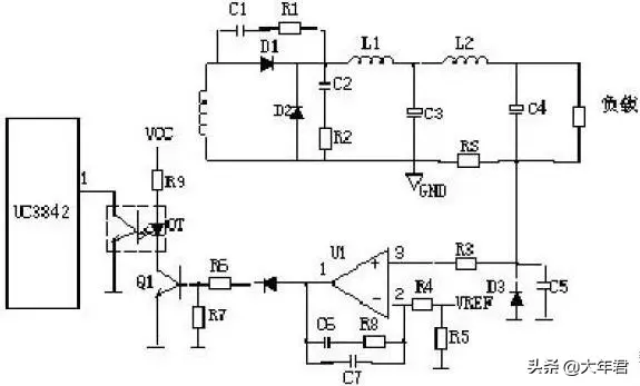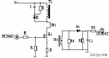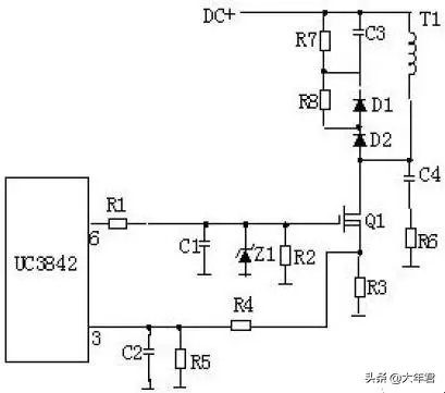 R4、C3、R5、R6、C4、D1、D2组成缓冲器,和开关MOS管并接,使开关管电压应力减少,EMI减少,不发生二次击穿。在开关管Q1关断时,变压器的原边线圈易产生尖峰电压和尖峰电流,这些元件组合一起,能很好地吸收尖峰电压和电流。从R3测得的电流峰值信号参与当前工作周波的占空比控制,因此是当前工作周波的电流限制。当R5上的电压达到1V时,UC3842停止工作,开关管Q1立即关断 。 R1和Q1中的结电容CGS、CGD一起组成RC网络,电容的充放电直接影响着开关管的开关速度。R1过小,易引起振荡,电磁干扰也会很大;R1过大,会降低开关管的开关速度。Z1通常将MOS管的GS电压限制在18V以下,从而保护了MOS管。
