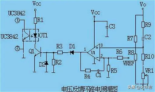 2、工作原理: 当输出U0升高,经取样电阻R7、R8、R10、VR1分压后,U1③脚电压升高,当其超过U1②脚基准电压后U1①脚输出高电平,使Q1导通,光耦OT1发光二极管发光,光电三极管导通,UC3842①脚电位相应变低,从而改变U1⑥脚输出占空比减小,U0降低。 当输出U0降低时,U1③脚电压降低,当其低过U1②脚基准电压后U1①脚输出低电平,Q1不导通,光耦OT1发光二极管不发光,光电三极管不导通,UC3842①脚电位升高,从而改变U1⑥脚输出占空比增大,U0降低。周而复始,从而使输出电压保持稳定。调节VR1可改变输出电压值。 反馈环路是影响开关电源稳定性的重要电路。如反馈电阻电容错、漏、虚焊等,会产生自激振荡,故障现象为:波形异常,空、满载振荡,输出电压不稳定等。