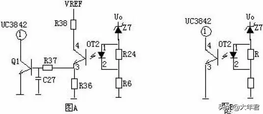 如上图,当Uo有过压现象时,稳压管击穿导通,经光耦(OT2)R6到地产生电流流过,光电耦合器的发光二极管发光,从而使光电耦合器的光敏三极管导通。Q1基极得电导通, 3842的③脚电降低,使IC关闭,停止整个电源的工作,Uo为零,周而复始,。
