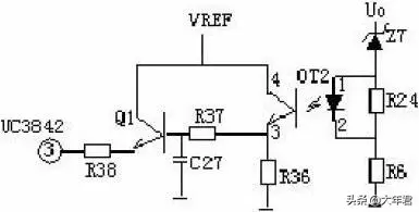 3、输出限压保护电路: 输出限压保护电路如下图,当输出电压升高,稳压管导通光耦导通,Q1基极有驱动电压而道通,UC3842③电压升高,输出降低,稳压管不导通,UC3842③电压降低,输出电压升高。周而复始,输出电压将稳定在一范围内(取决于稳压管的稳压值)。