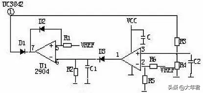 当输出电路短路或过流,变压器原边电流增大,R3 两端电压降增大,③脚电压升高,UC3842⑥脚输出占空 比逐渐增大,③脚电压超过1V时,UC3842关闭无输出。