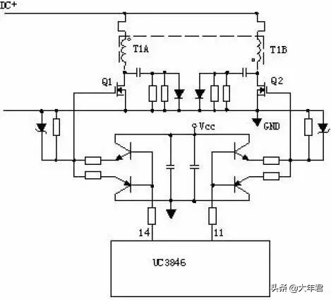 4、推挽式功率变换电路: Q1和Q2将轮流导通。