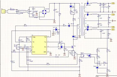 以上两种均是非隔离电源,下面我们来学习一下隔离电源。隔离电源通常在系统中有高压电源时会应用到,为了不干扰低压系统选择隔离电源。隔离电源可以多路输出,通常选择电源品质要求较高一路电源作为反馈,在不同负载时其他路电源会存在一定的电压变化。工业上常用的一个芯片UC3843,根据需要可选择UC3842、UC3843、UC3844、UC3845,不同点在于输入电压值和输出占空比的最大值。基本电路如图