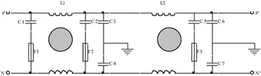图中L1、L2、C3、C4、C6、C7构成共模滤波,C1、C2、C5属于差模滤波。差模滤波电容比较大,主要滤低频干扰,共模电容比较小,滤高频干扰。