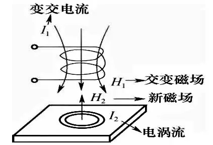 将一导体(如金属)置入交变磁场中,导体内部的磁通量持续变化,从而在导体内产生环状且闭合的感应电动势。由于导体内部电阻很小,进而产生较大的感应电流。电流方向沿导体的圆周方向转圈,就像一圈圈的漩涡。由此,将整块导体内部因发生电磁感应而产生感应电流的现象,称为涡流现象。