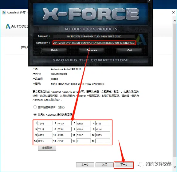 31.全部选中Activeation中生成的激活码(仔细检查是否复制完整),使用Ctrl+C键或者鼠标右击复制生成的激活码,然后使用Ctrl+V键粘贴激活码至我具有Autodesk提供的激活码方框中,最后点击【下一步】。