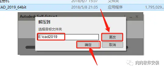 5.点击【更改】选择解压目标文件夹,可在D盘或其它盘里面新建一个CAD文件夹(文件夹名称中不要有中文),设置好解压路径后点击【确定】。