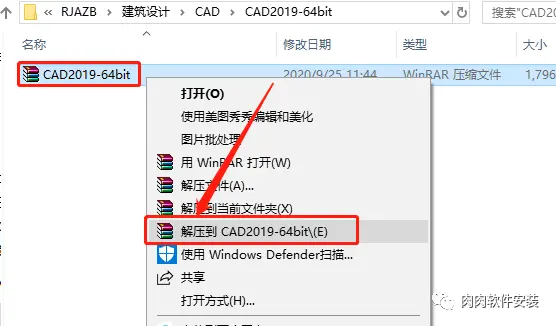 1.打开下载好的CAD2019安装包,鼠标右击压缩包,选择解压到【CAD2019-64bit】。