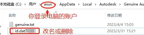 2、进入目录C:\Users\电脑登录的用户名\AppData\Local\Autodesk\Genuine Autodesk Service\,将id.dat改名或删除