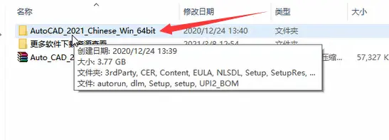 2、双击进入新解压出来的AutoCAD2021安装包文件夹内;