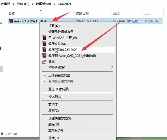 1:根据上方我提供的下载地址,先将CAD2021安装包下载到自己的电脑上,在电脑上找到此安装包,这是一个压缩包文件,用鼠标右键单击,点解压到当前文件夹,等待解压完成;