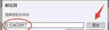 点击更改,选择解压目标文件夹,可在D盘或其它盘里面新建一个CAD2017文件夹,然后点击确定(大概需要3分钟左右)。注意不要选择C盘(因为文件过大)