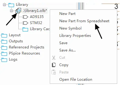 第一步,右击.olb文件,点选New Part From Spreadsheet,如图1所示。