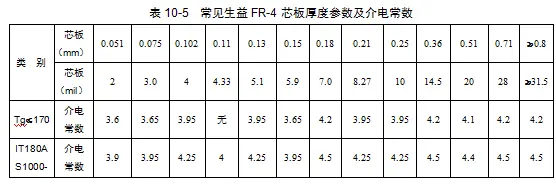 普通的FR-4板材一般有生益、建滔、联茂等板材供应商。生益FR-4及同等材料芯板可以根据板厚来划分。表10-5列出了常见生益FR-4芯板厚度参数及介电常数。